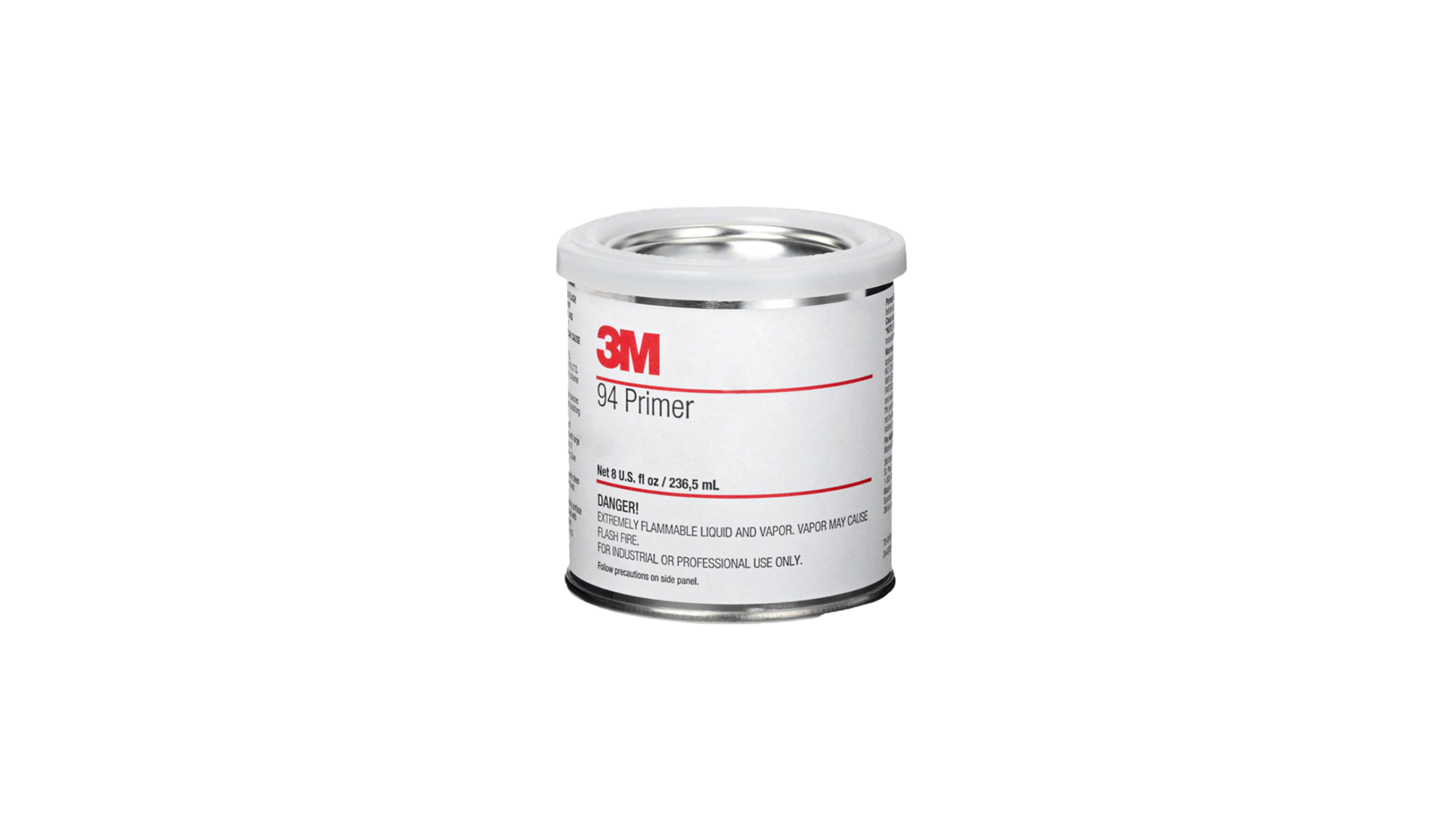 3M 94 Adhesion Promoter, also known as 3M 94 Tape Primer, is a liquid primer used to improve the adhesion of 3M Acrylic Foam Tapes. It can be used for the substrates of Polyethylene (PE), Polypropylene (PP), ABS, PET/PBT blends, concrete, wood, glass, metal and painted metal surfaces.