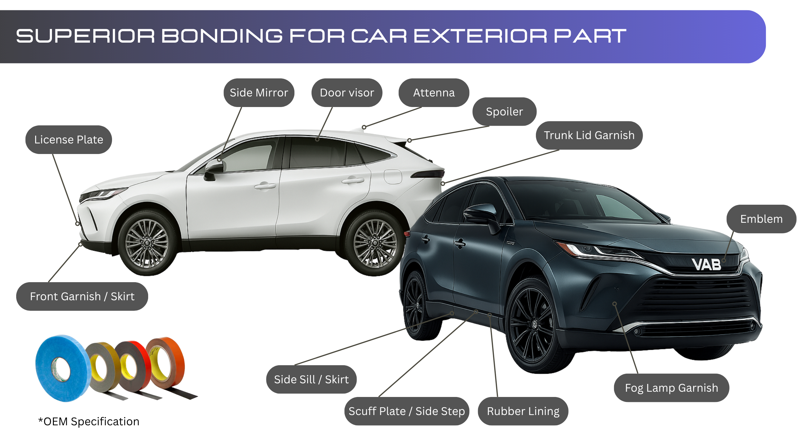 At V.A.B. Industries, we offer high-performance double-sided foam tapes that meet stringent Automotive OEM specifications. Our product range supports a wide variety of applications—from interior trims to exterior components, from small emblems to large body skirts. Available in both roll form and custom-shaped patterns, our tapes are engineered for reliability and durability.